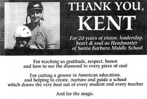| For over 20 years (1979-2000), Kent was Headmaster of the Santa Barbara Middle School. This highly successful and innovative school (the only independent middle school in California which is fully accredited by the 150 member California Association of Independent Schools) began as nothing more than a dream. In the early years Kent gave the school his books, car, and computer! By year three SBMS had achieved full enrollment and balanced budgets, and has maintained both since that time. In 1989 Kent moved the school from its rented facilities to a beautiful seventeen acre campus and volunteers worked hard to completely restore an old Franciscan monastery. Playing fields, gardens, a theatre, three computer labs, a deli, and school store were added, and an old gym was given new life. Around one third of the teachers were once students at SBMS, while half of the faculty began their connection with the school first as parents of enrolled students. | ||