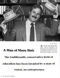 | For over 20 years (1979-2000), Kent was Headmaster of the Santa Barbara Middle School. This highly successful and innovative school (the only independent middle school in California which is fully accredited by the 150 member California Association of Independent Schools) began as nothing more than a dream. In the early years Kent gave the school his books, car, and computer! By year three SBMS had achieved full enrollment and balanced budgets, and has maintained both since that time. In 1989 Kent moved the school from its rented facilities to a beautiful seventeen acre campus and volunteers worked hard to completely restore an old Franciscan monastery. Playing fields, gardens, a theatre, three computer labs, a deli, and school store were added, and an old gym was given new life. Around one third of the teachers were once students at SBMS, while half of the faculty began their connection with the school first as parents of enrolled students. | ||